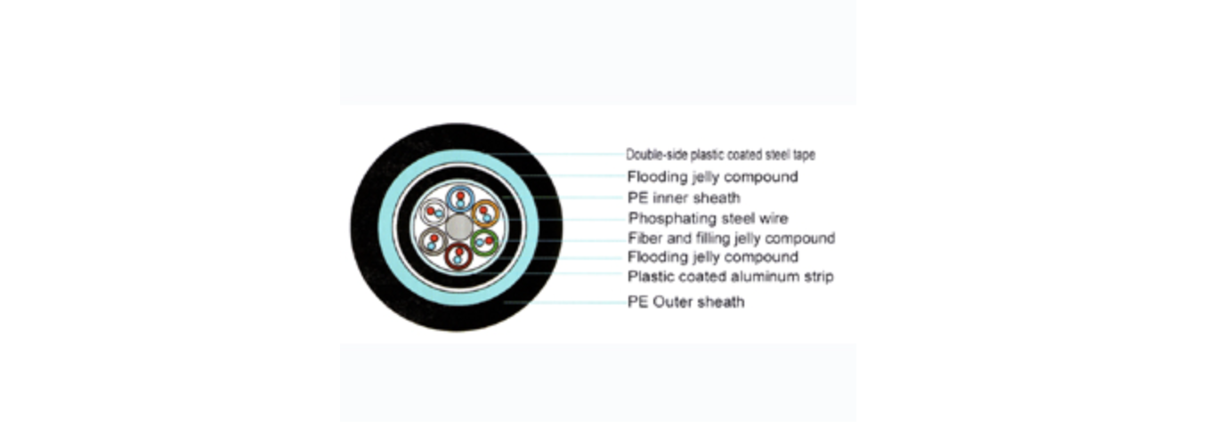 - Structure with aluminium tape against moisture, corrugated steel tape as armor, loose tube stranding and double sheaths