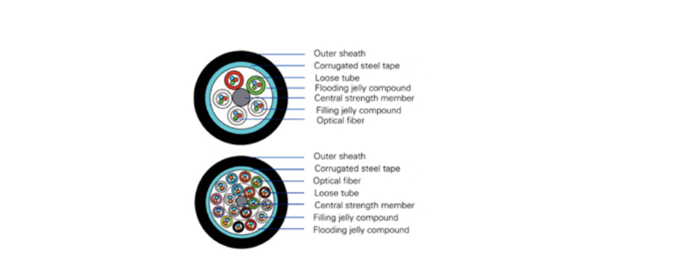 - Corrugated steel tape armoring, loose tube stranding with single sheath
