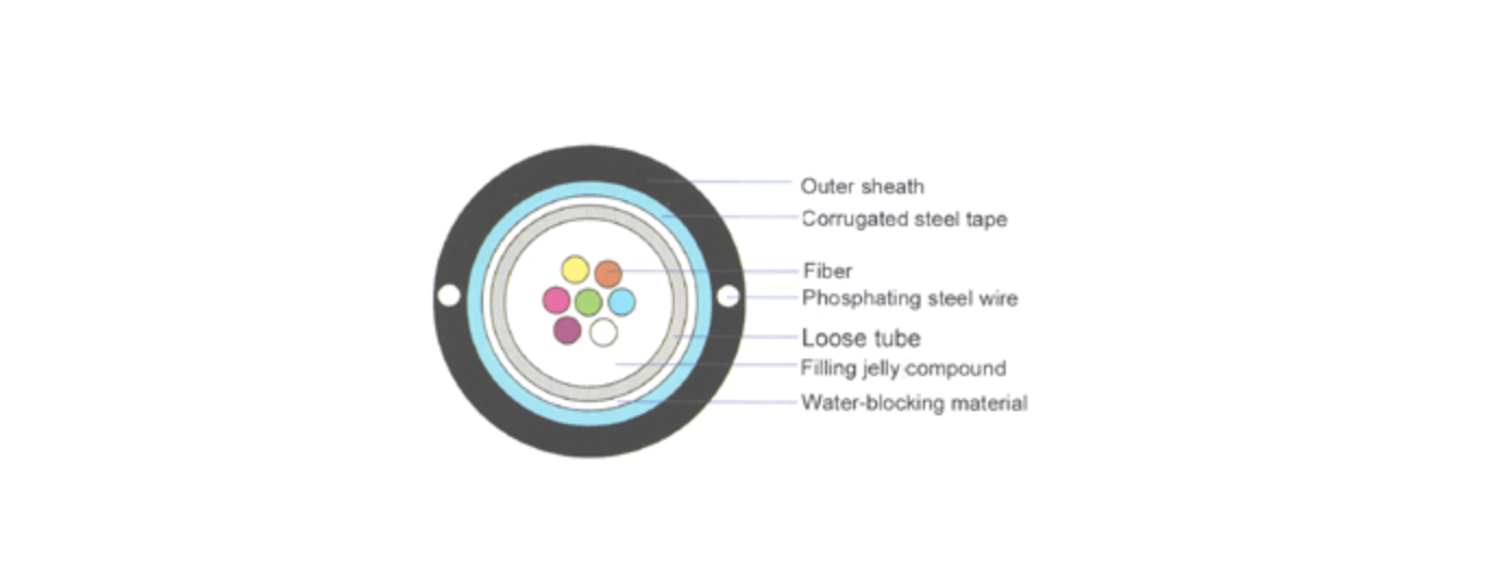 - Structure with central tube and glass yarn reinforced, corrugated steel tape armoring