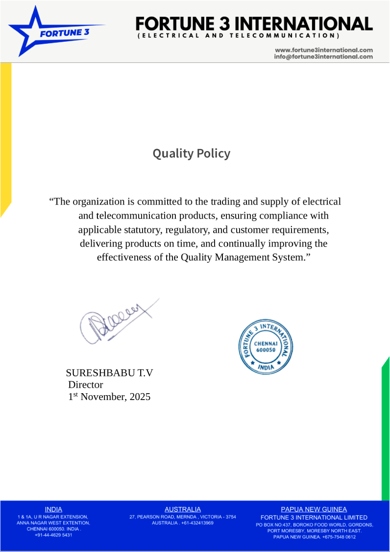 We provide Products meeting international Quality Compliance and also proven at various client sites. Our quality inspecting department has no compromising testing methods and processes which will ensure quality products are sourced and delivered for our end customers.